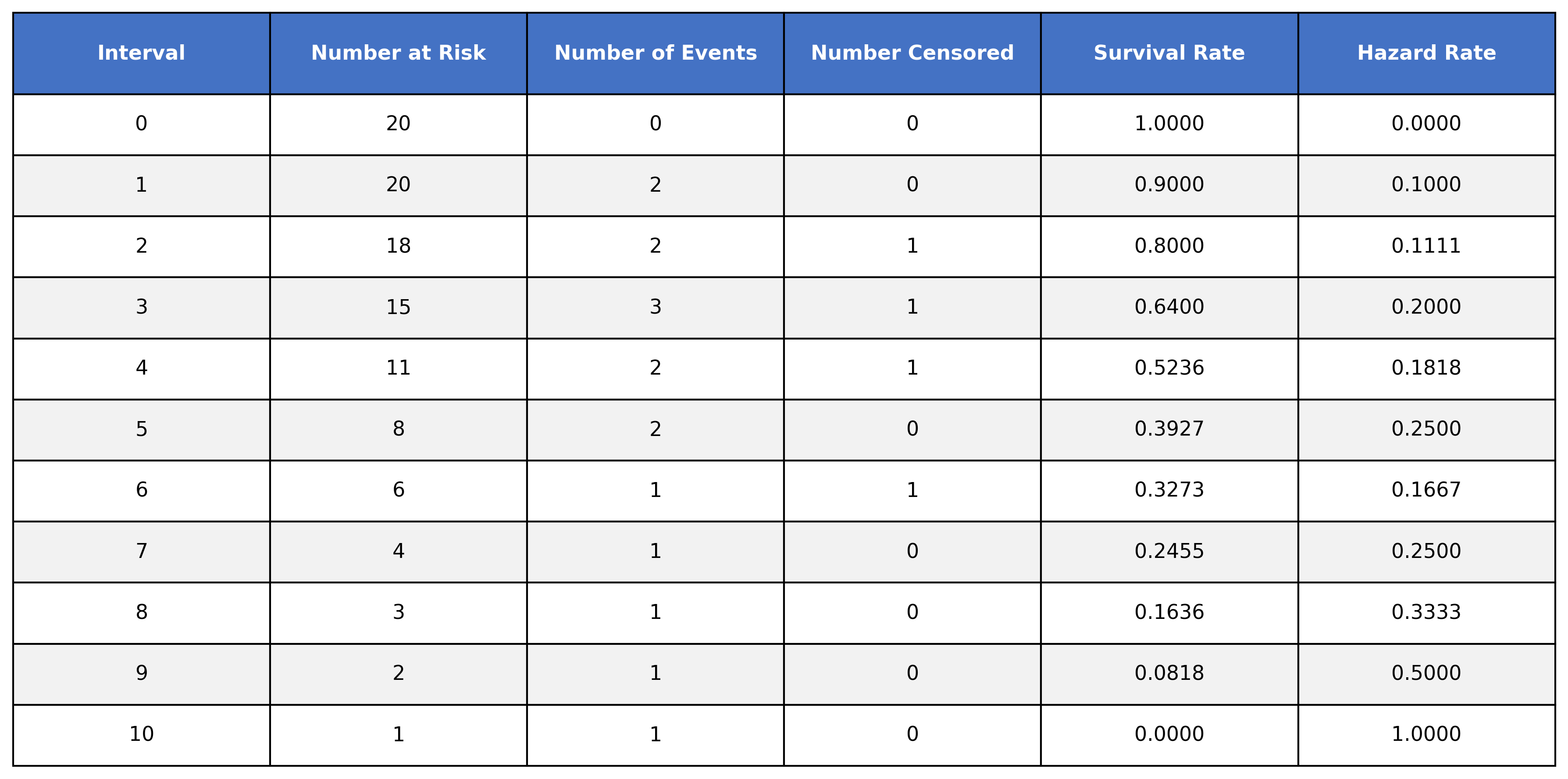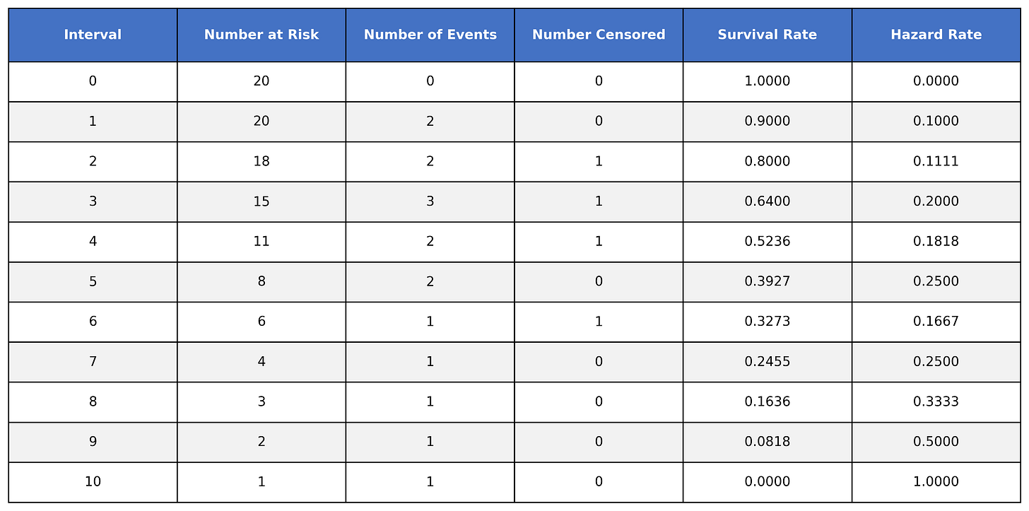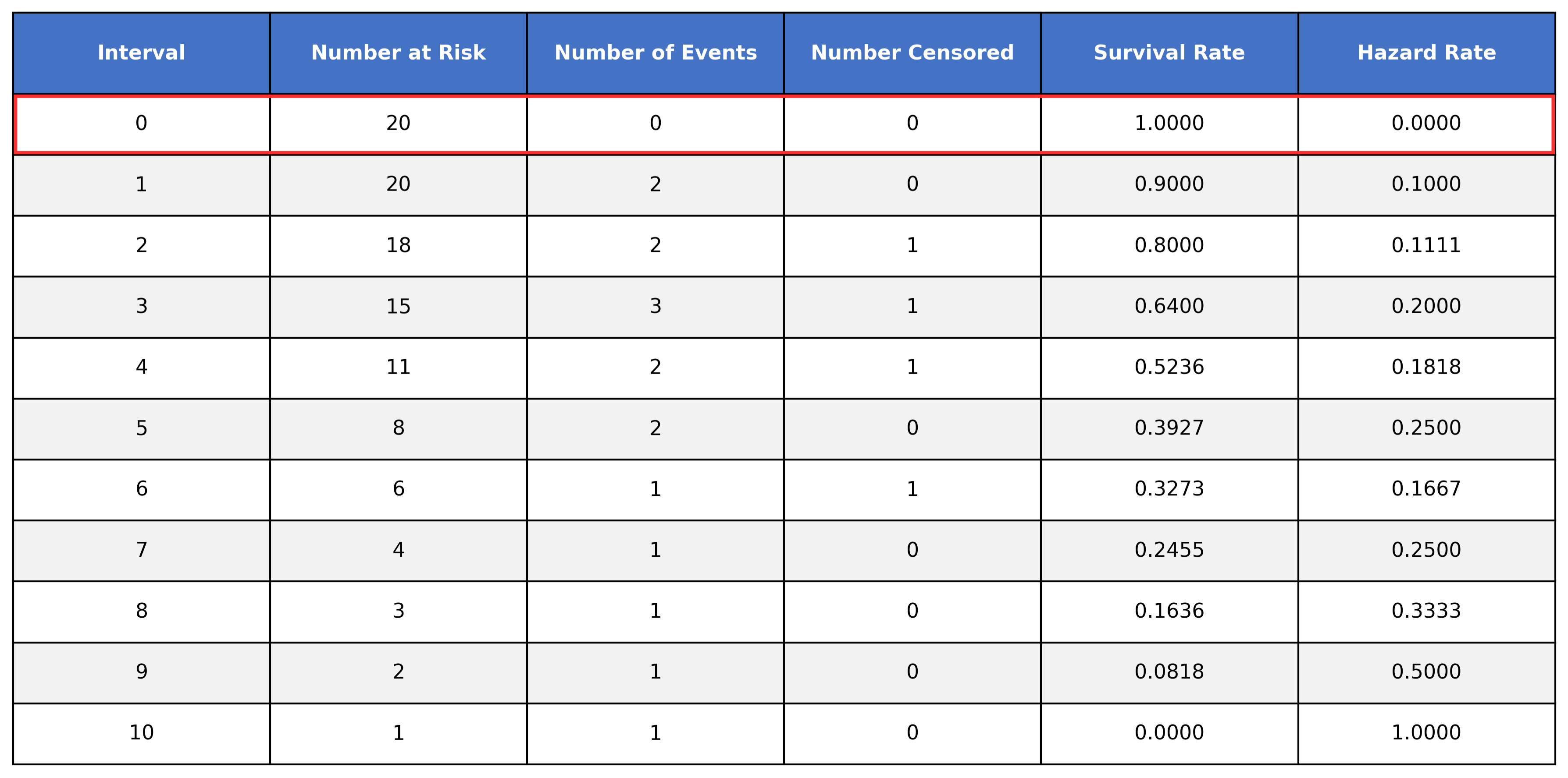 Looking at interval 0, we can see that all 20 subjects are at risk and no events were observed (this is usually assumed in survival analysis as time 0 is the exact time we started measuring). As such, all participants survived until interval 0 and the hazard rate is 0.