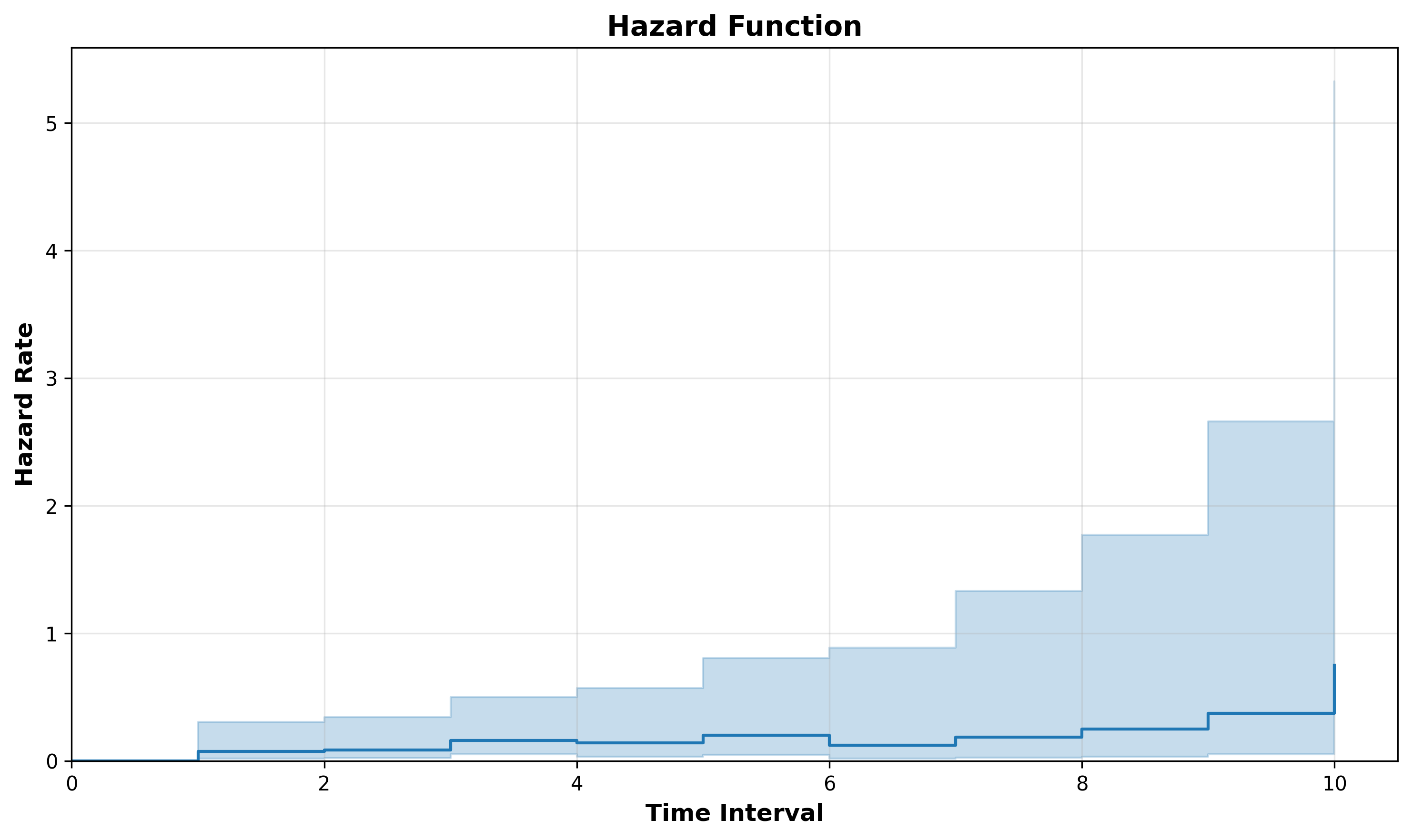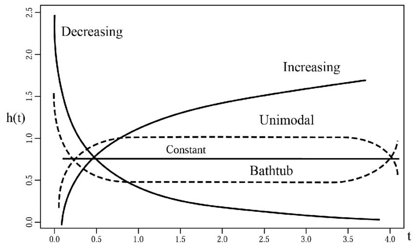 How the hazard function changes over time is particularly of interest. For example, if the hazard function increases over time, that means the likelihood of the subject experiencing the event increases faster as it ages. On the other hand, if the hazard function decreases over time, that means the likelihood of the subject experiencing the event decreases as it ages.