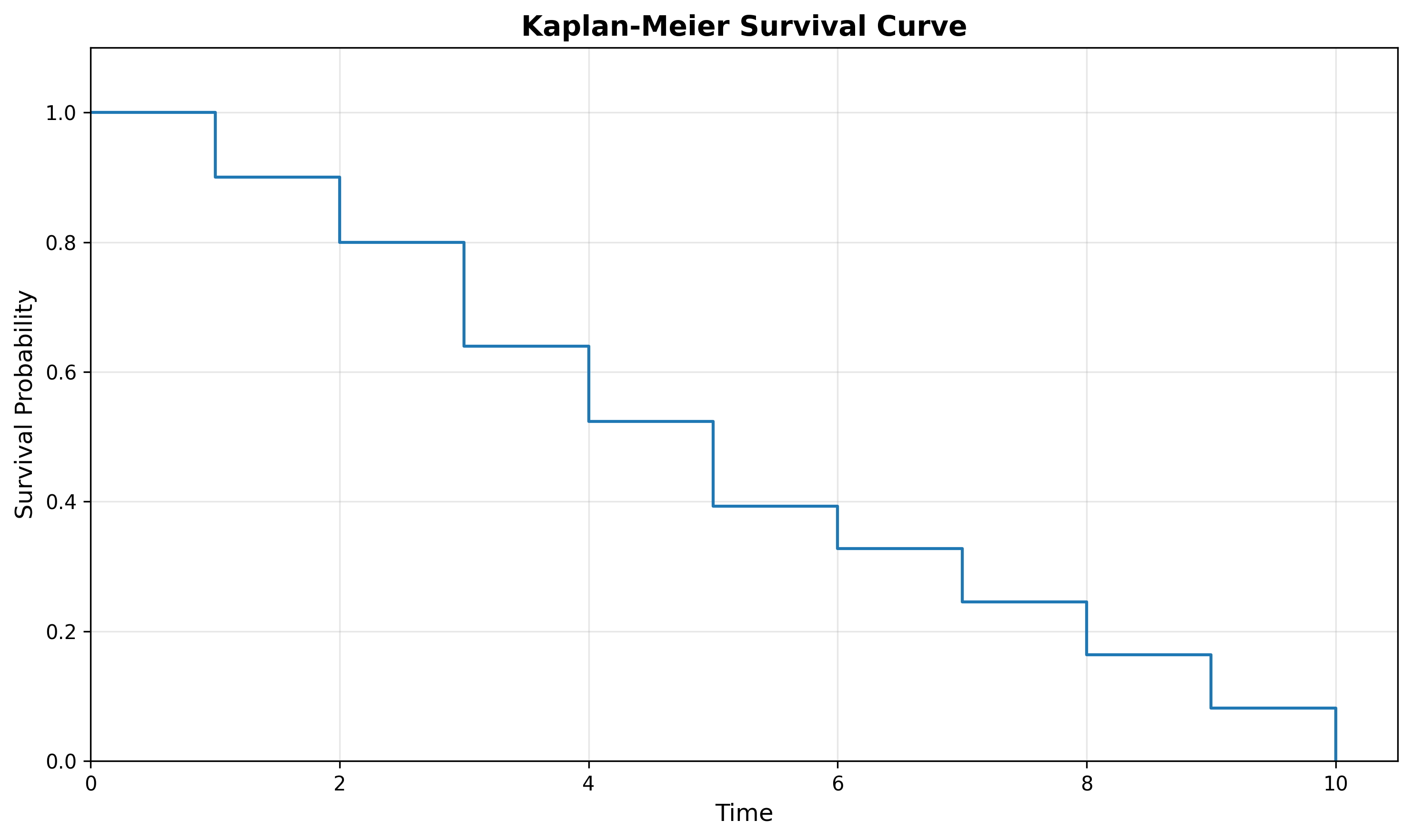 Notice that the above survival curve is a step-function (it looks like a set of stairs). Each vertical drop in the curve is where one or more events were observed. For example, events were observed at durations 1, 2, 3, 4, etc.