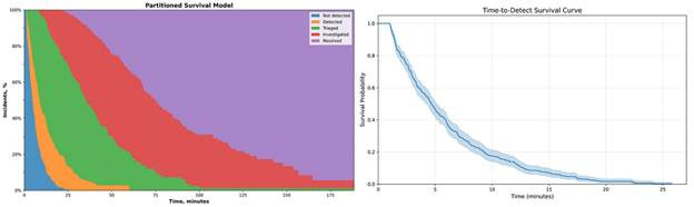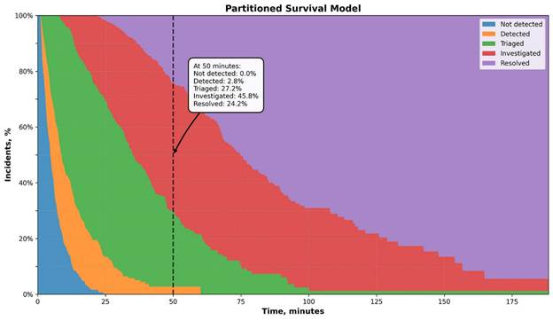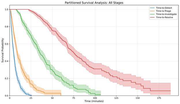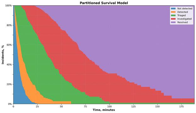 This is important when comparing survival curves in a partitioned model. We might see an improvement in incidents being resolved faster from Q1 to Q2, but this improvement could be due to faster detection, triage, investigation, and/or investigation. In order to identify improvement in a specific step, we need to measure the area between the curves (the shaded areas on our stacked area chart). The area between the curve is equivalent to the individual survival curve if analyzed independently.