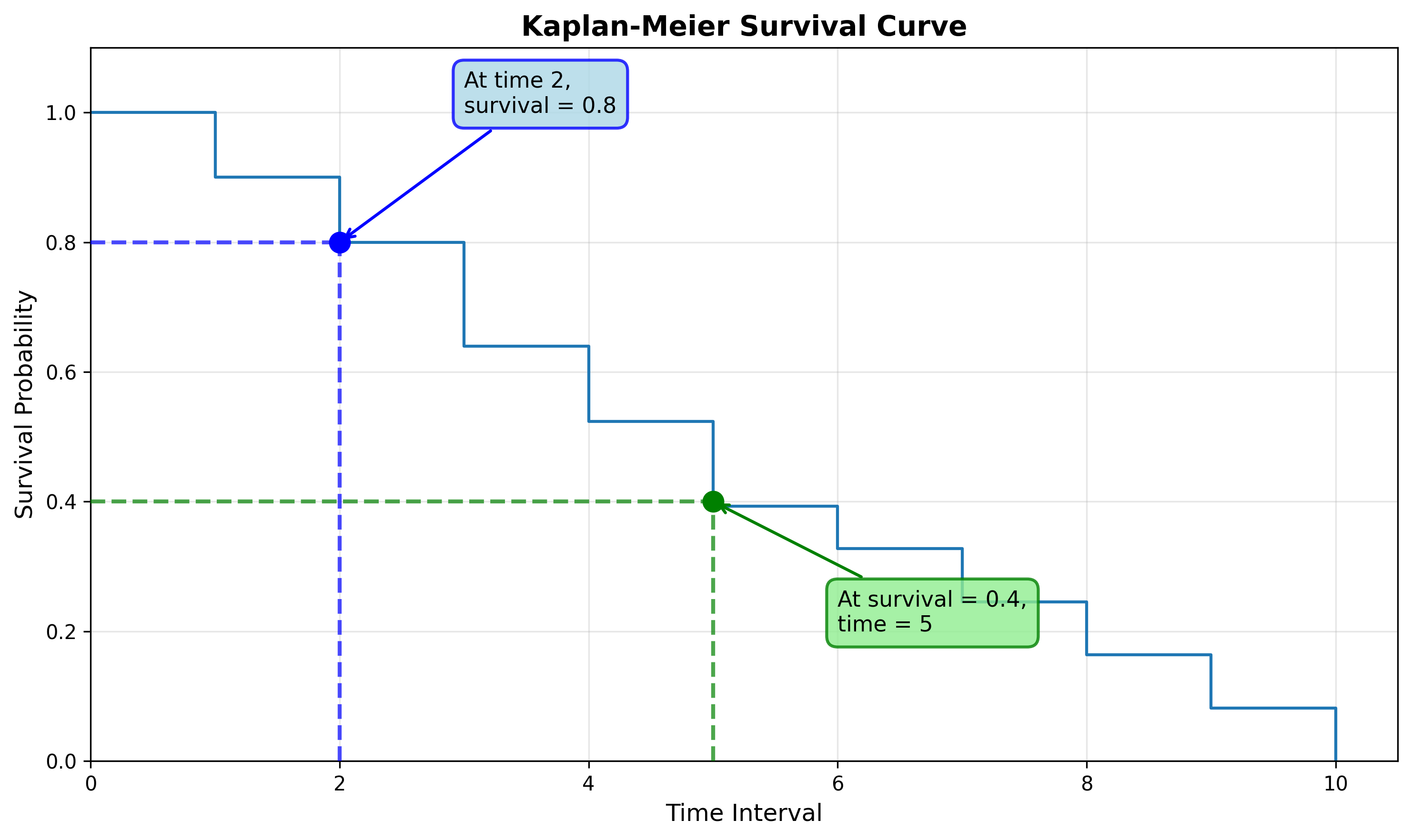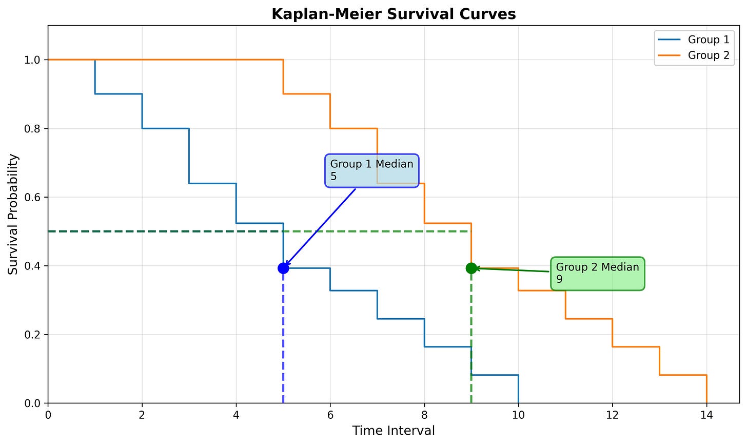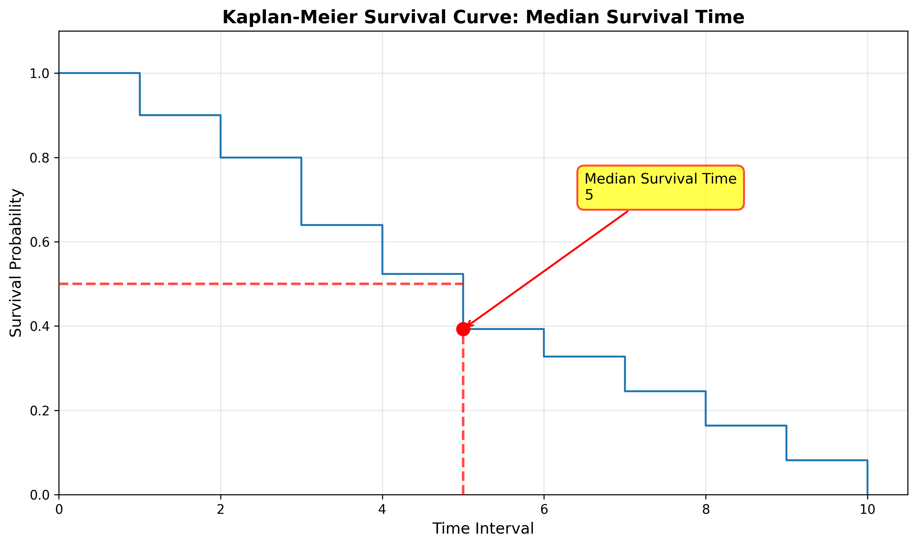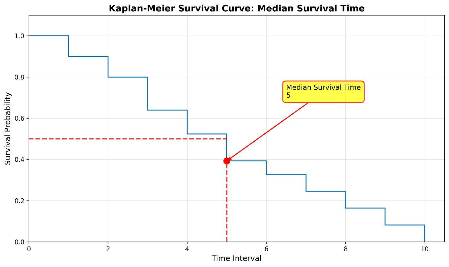 We can calculate the median survival time by looking at the time where the survival function equals 0.5 (50%). We can interpret this as, “50% of subjects will experience the event by the median survival time”. Or, given our example below, “50% of subjects will experience the event by time interval 5.”