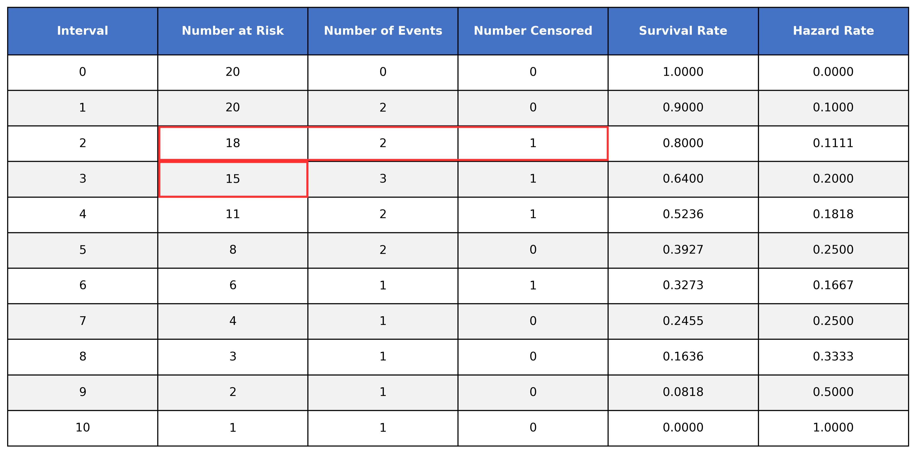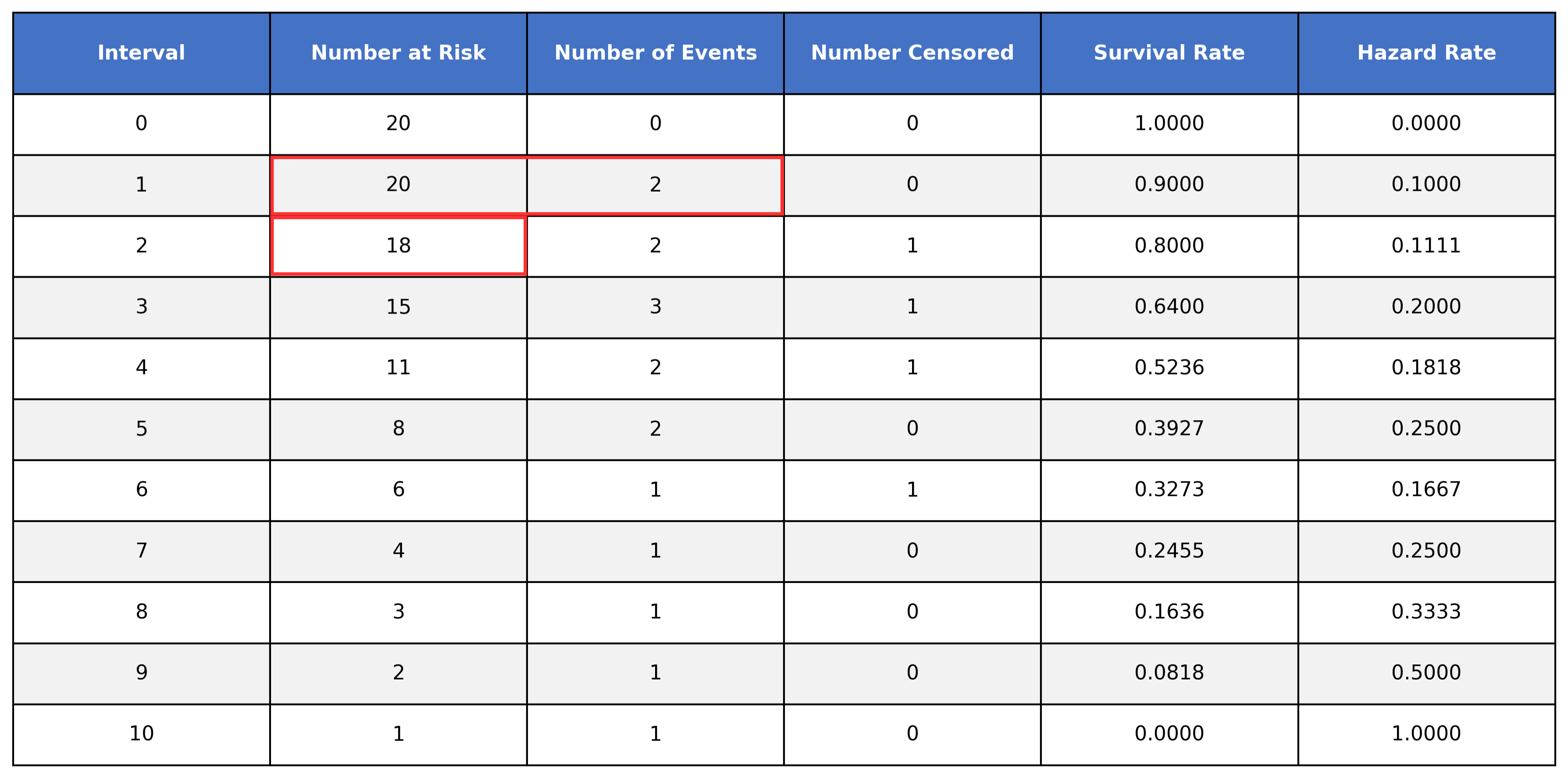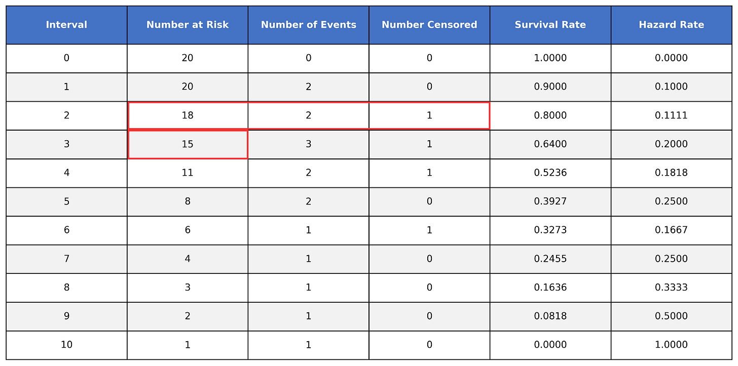 When we move down to time interval 1, we see that we have 20 subjects at risk. Of those 20 at risk, 2 of them experienced the event during this interval, while 18 of them survived the interval. Looking at time interval 2, we can see how the 18 survivors from interval 1 are at risk to experience the event during interval 2.