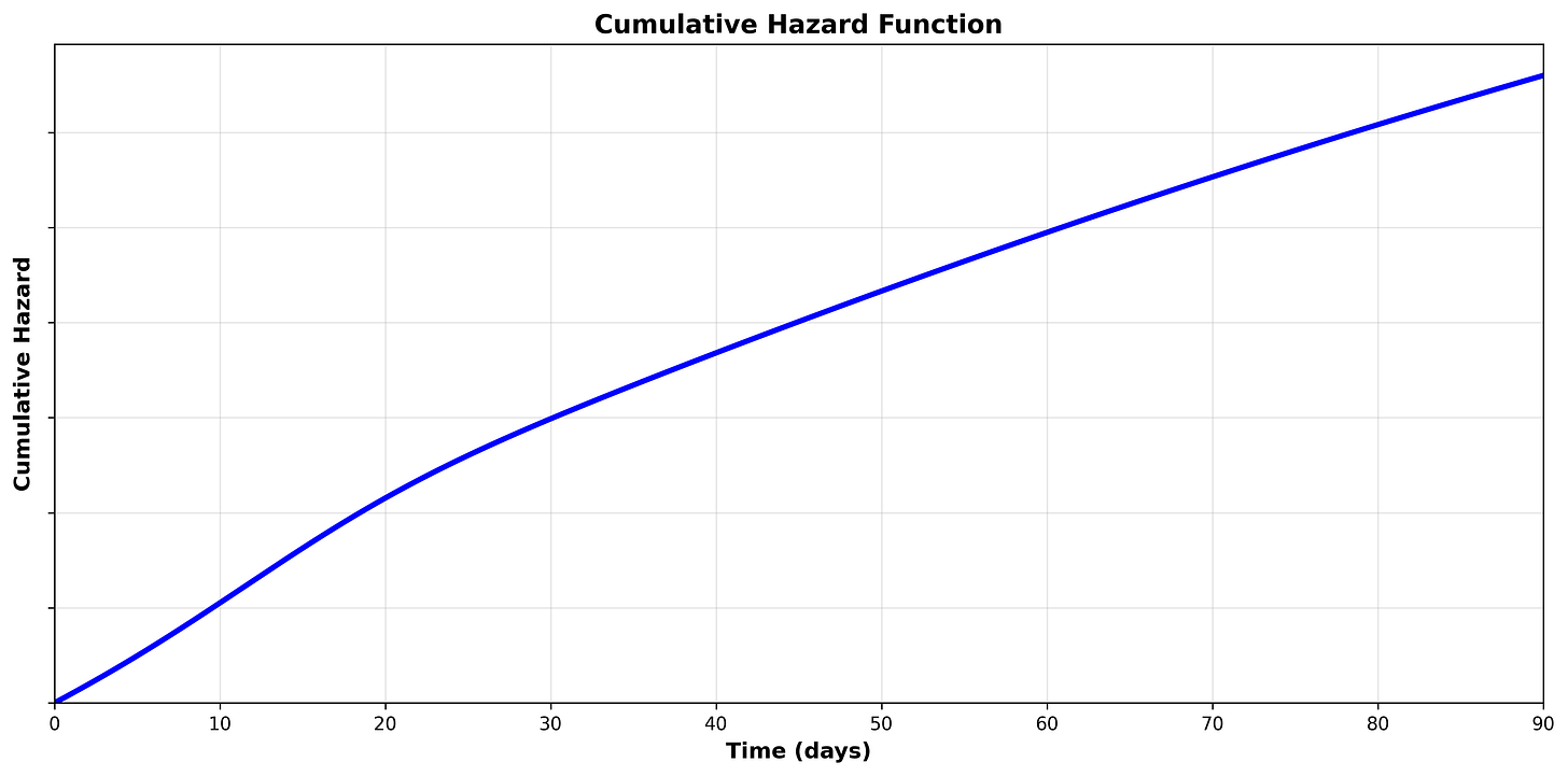 The cumulative hazard function, on the other hand, takes into account that for a subject to survive until a specific time, they must also face the risk of every time point before that. In our example of retrieving assets after employee leave, while the rate of retrieval may be low at 90 days, most assets are retrieved prior to 90 days as the likelihood an asset is retrieved within 90 days is very high.