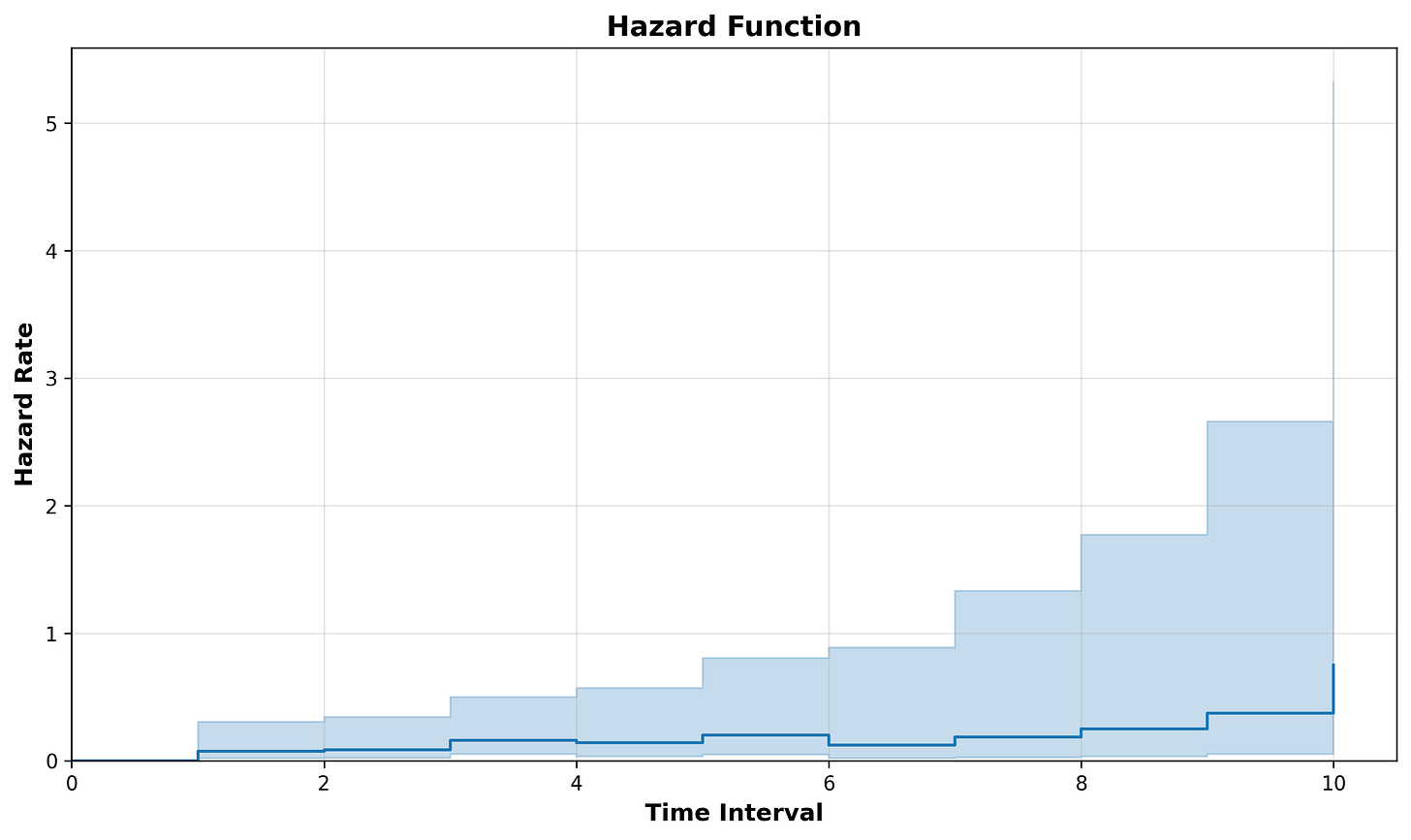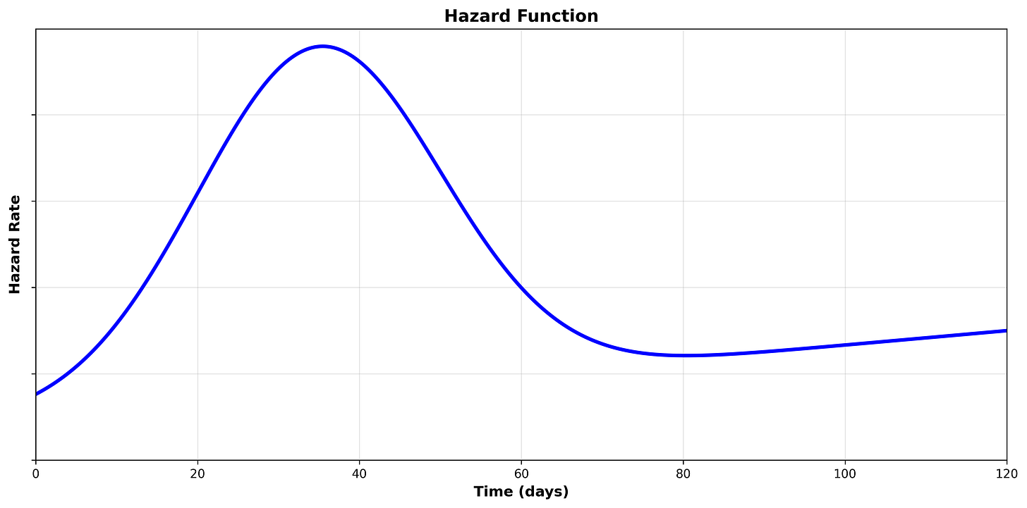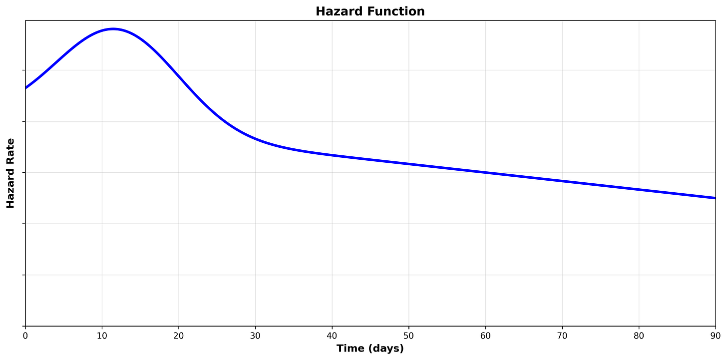 Think of it this way: The hazard function assumes that the subject has already survived until a specific point in time, so, given that fact, what does that tell us about their risk of experiencing the event now? In our example of retrieving assets after employee leave, the fact that the assets haven’t been retrieved in 90 days means they less likely to be retrieved right now than they were in the first 7 days.