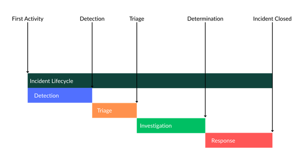 For example, when measuring the efficiency of a Security Operations Center (SOC) in detecting and responding to security events, security teams may measure the following time-to-event data for an incident: