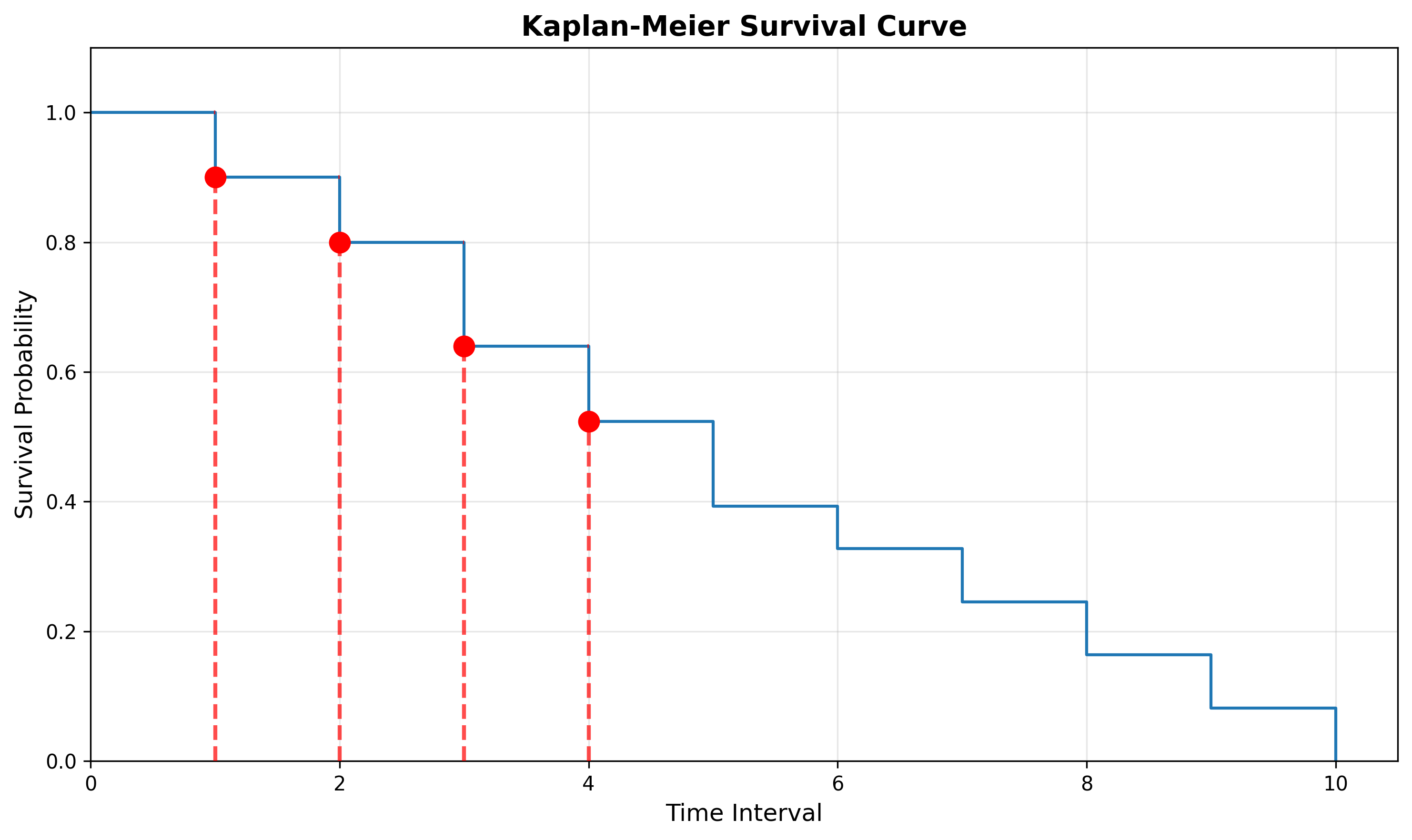 Note: Using a Kaplan-Meier Estimator is as simple as running KaplanMeierFitter() in a statistical library such as Python’s Lifelines. However, I will briefly explain the math so you have a basic understanding of what’s happening under the hood.