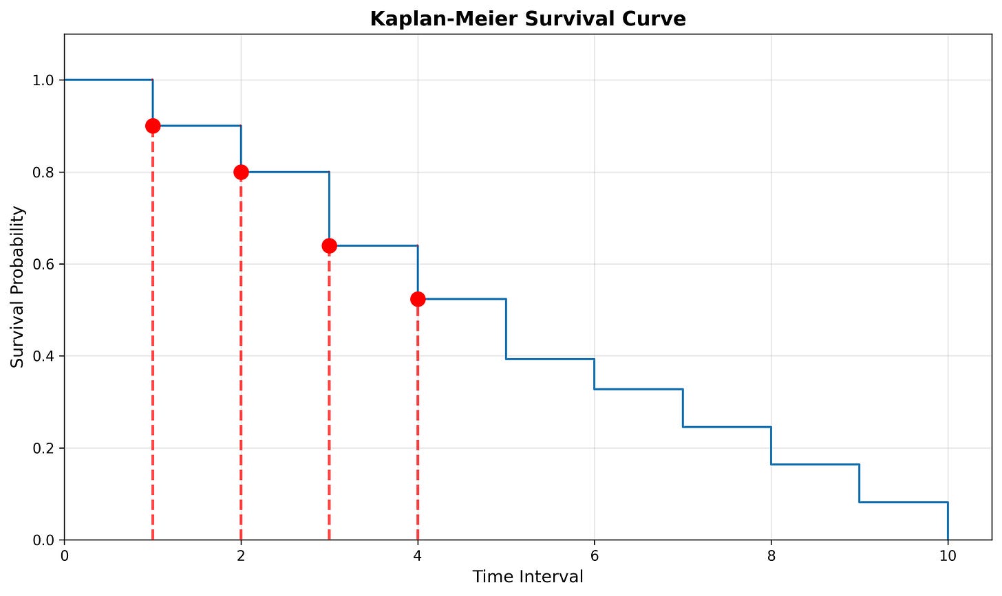 The concept Kaplan and Meier introduced is relatively simple: break up the duration into intervals, calculate the probability of surviving during each interval, and then multiply them together. We multiply them together because a subject must survive each preceding interval. For example, in order for a subject to have a chance of surviving until day 20, they must first survive from day 0-1, then 1-2, then 2-3, and so on.