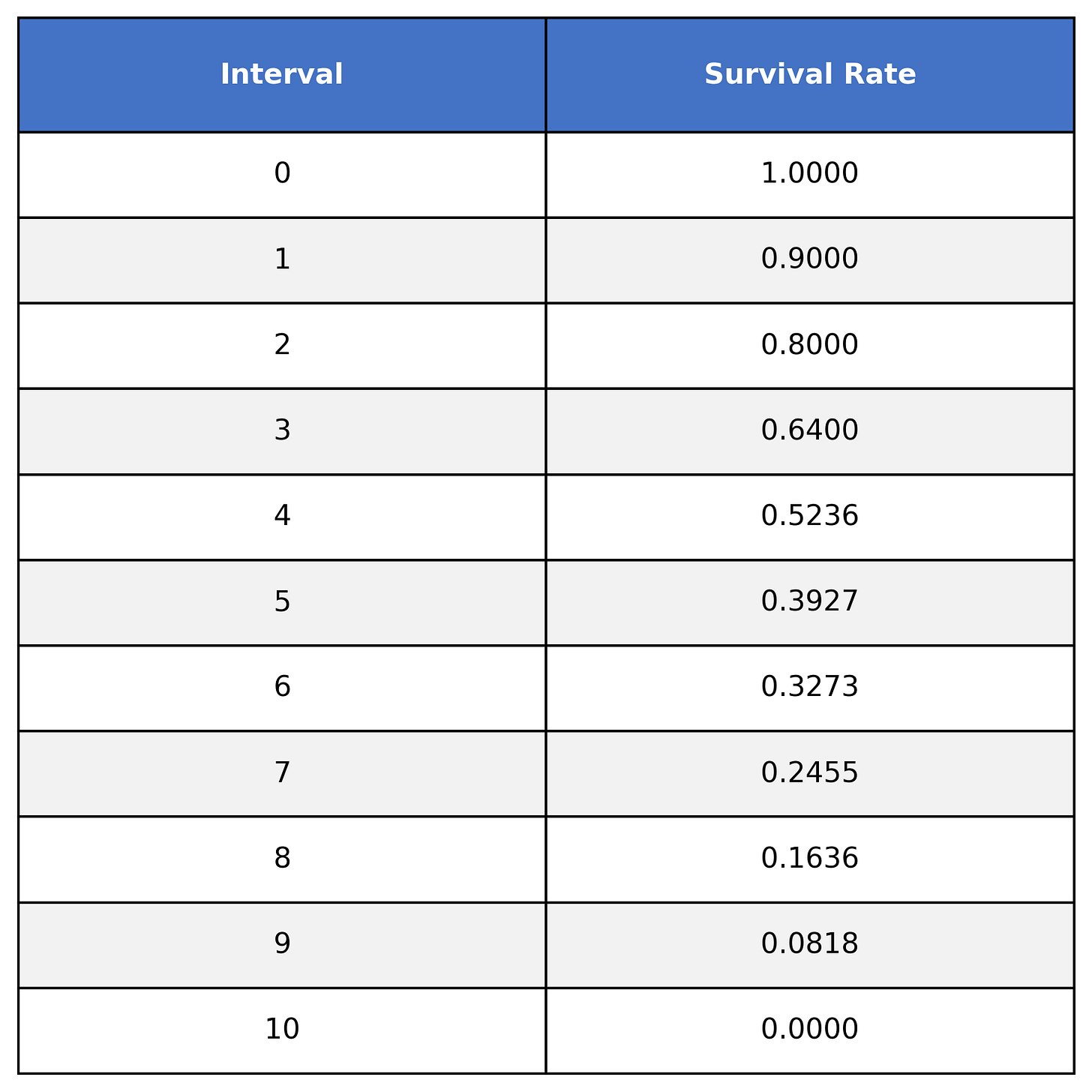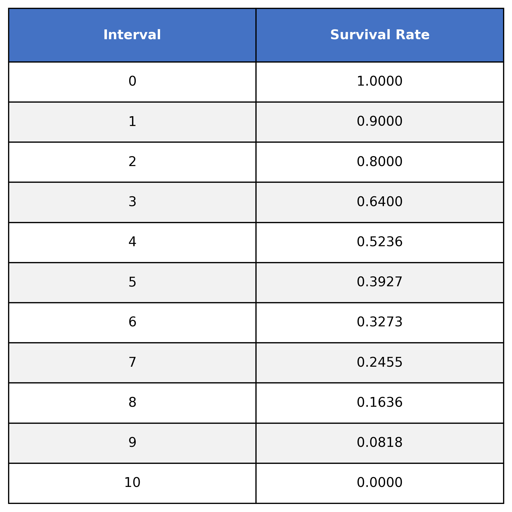 We can represent this graphically by plotting the interval column on the x-axis and survival rate on the y-axis: