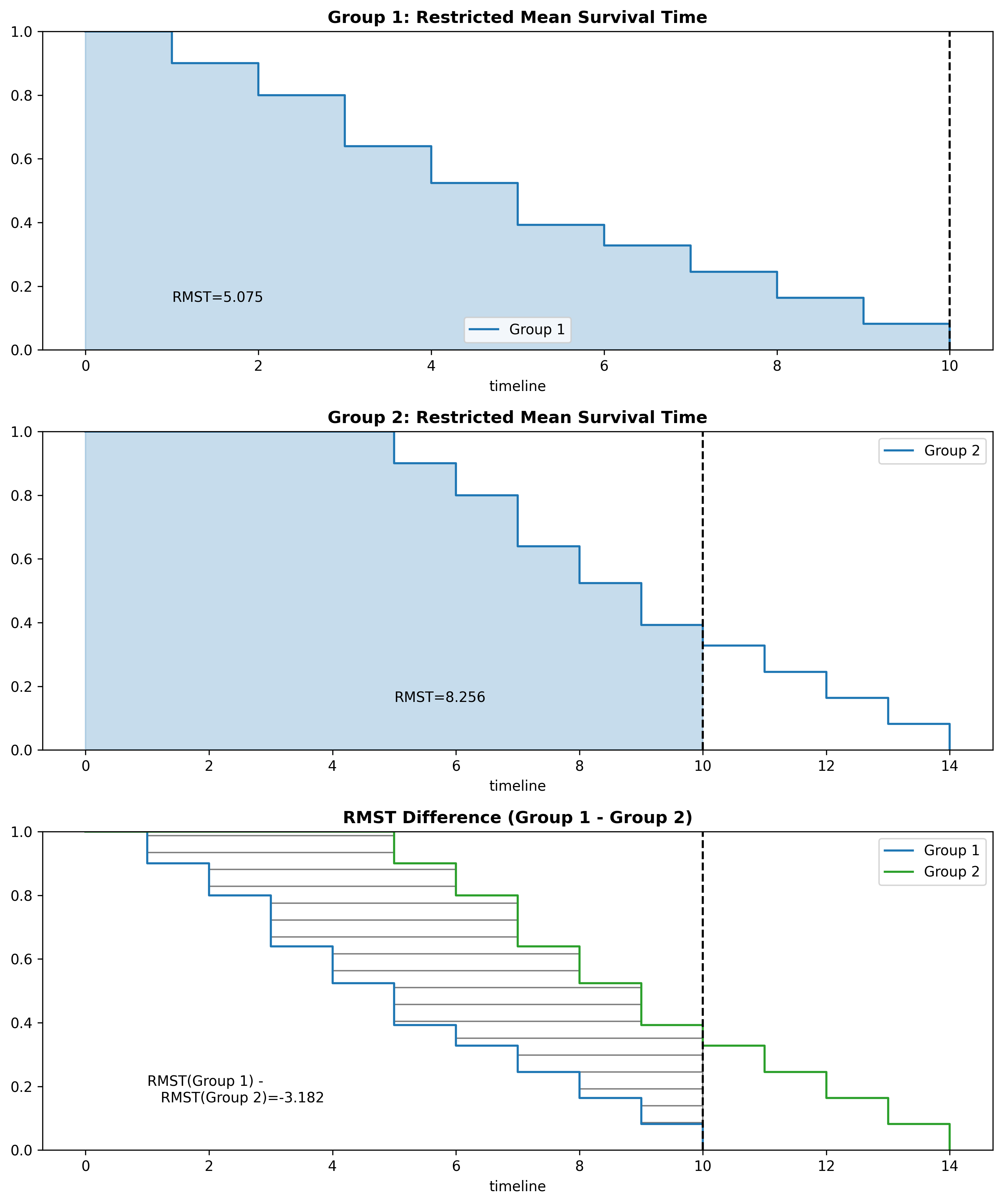 If we have the RMST for two curves using the same period, we can subtract them to find the area between the two curves: