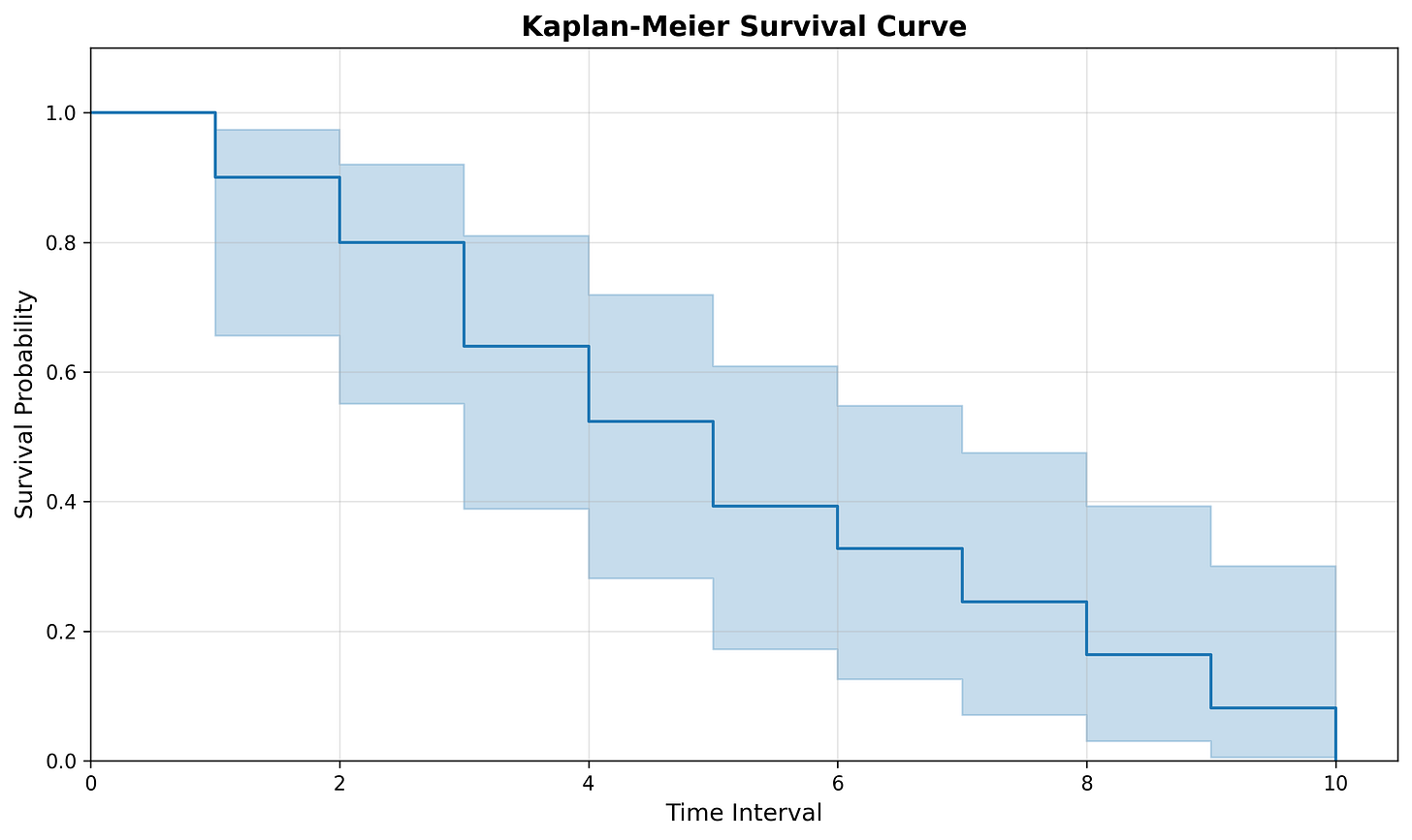Remember that the Kaplan-Meier Estimator is estimating the survival function. Because we are estimating and don’t know the true curve, you’ll often see the curve plotted with confidence intervals (usually as a shaded region).