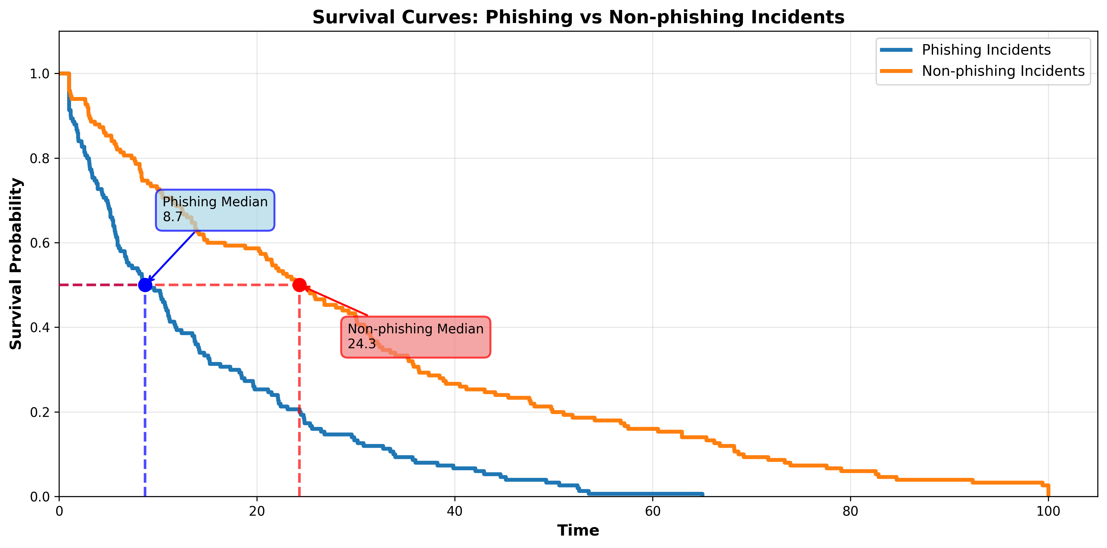 At first glance it appears that phishing incidents are in fact resolved faster than non-phishing incidents. Let’s quickly compare the median survival times: