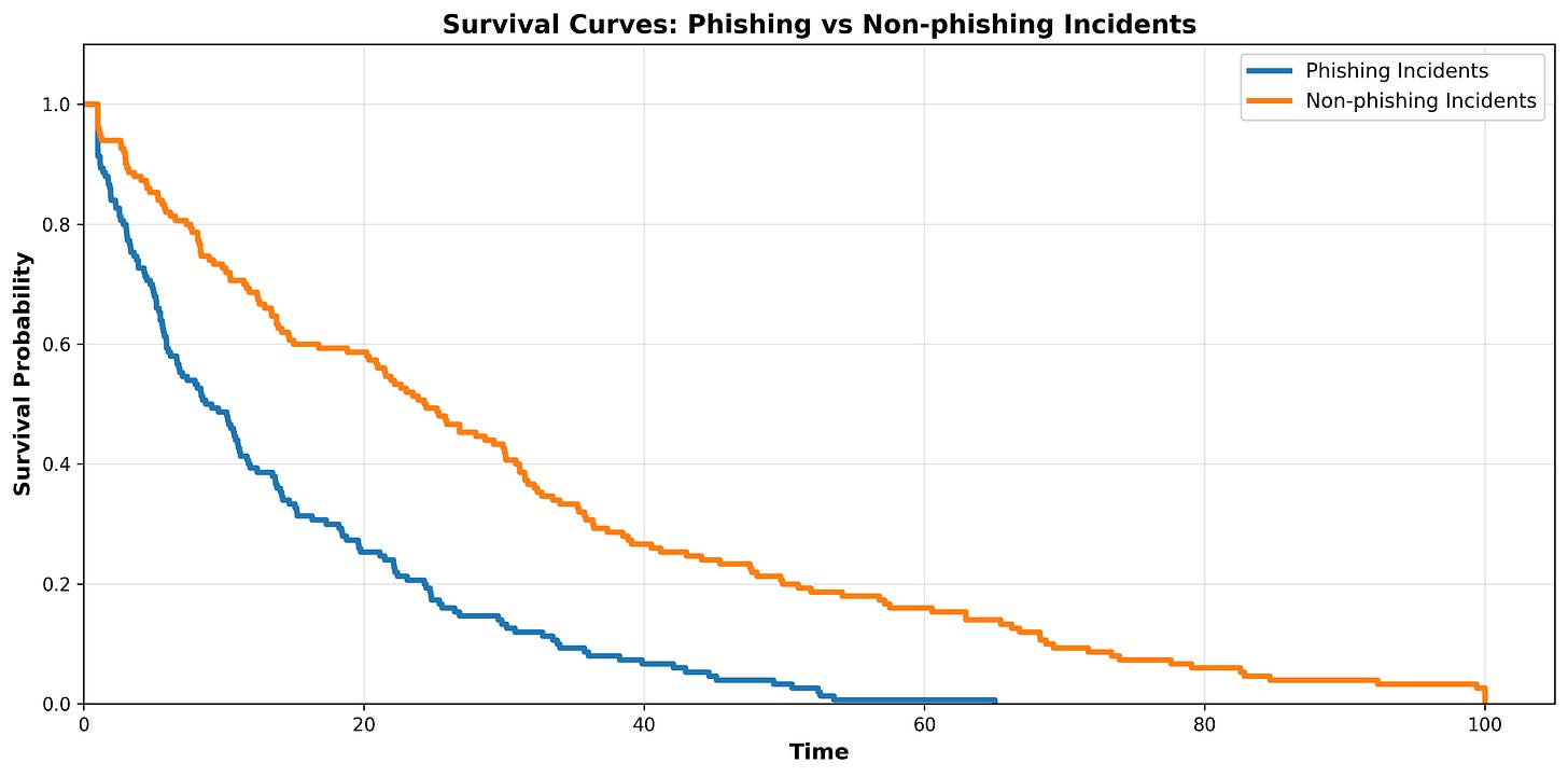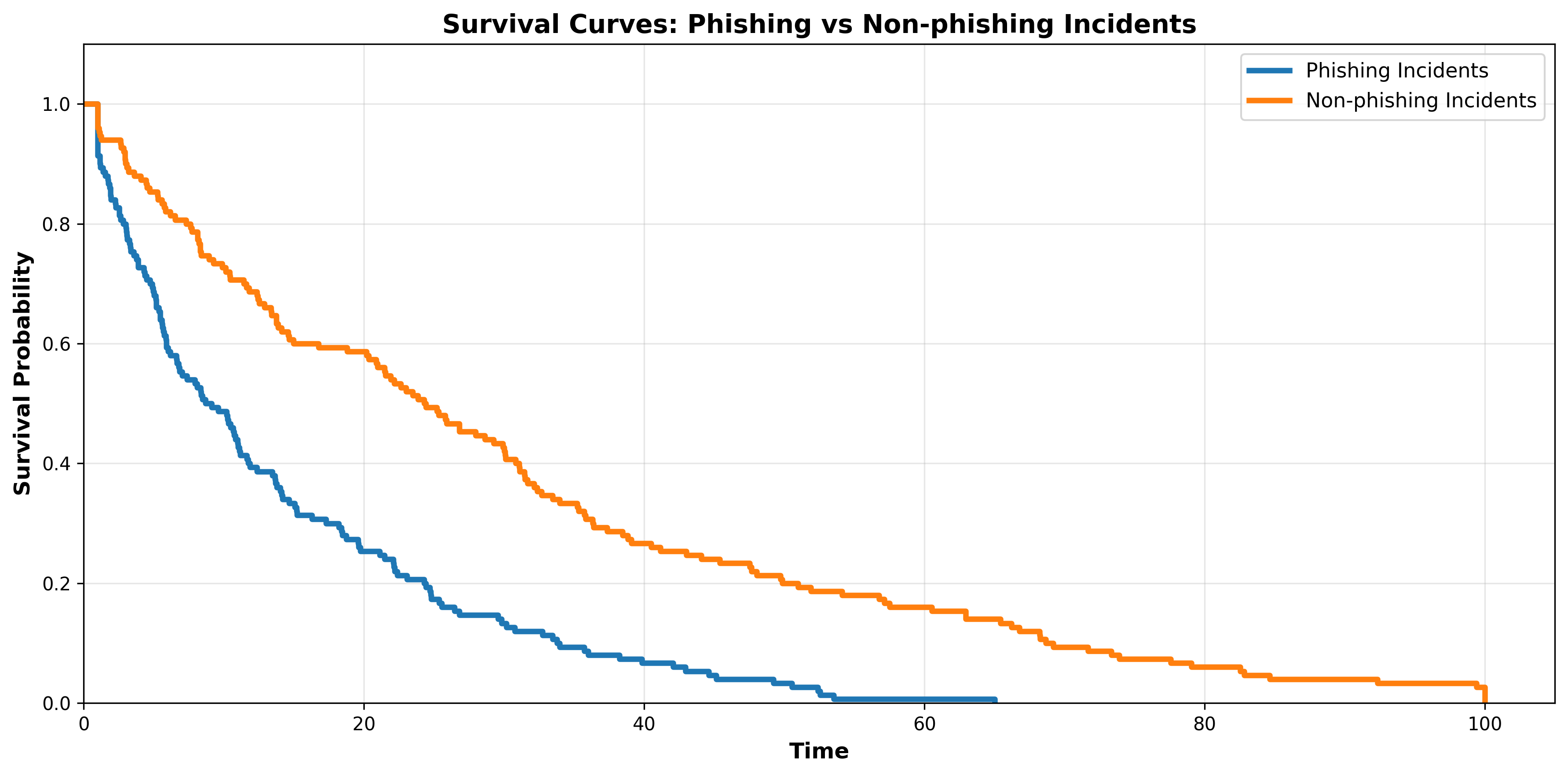 We may want to test if two survival functions are statistically different. For example, we may take a dataset and create two survival functions, one for the time-to-resolve for phishing incidents, and one for non-phishing incidents. When we plot the two curves they look like this: