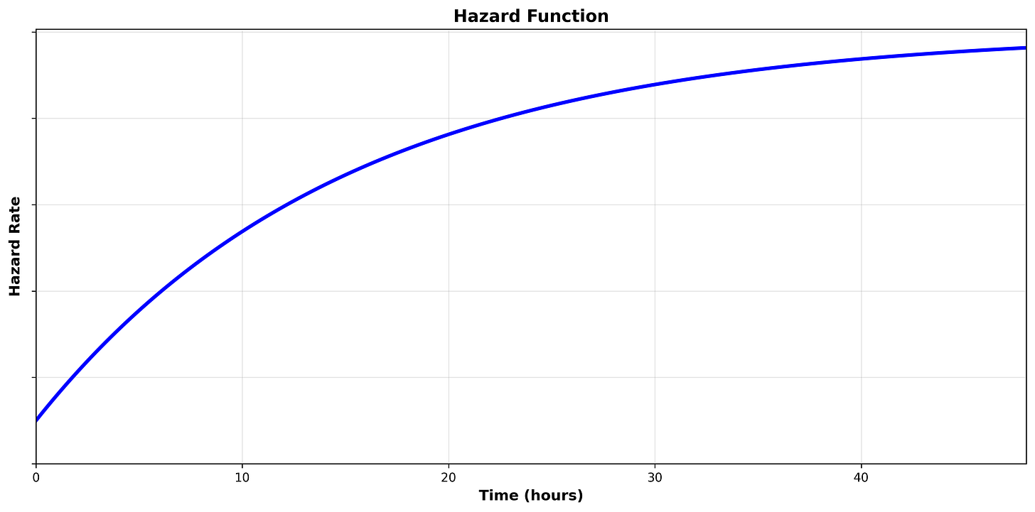 We may expect that the hazard starts low when the alert is first triggered, and the likelihood of the alert being resolved continues to increases over time.