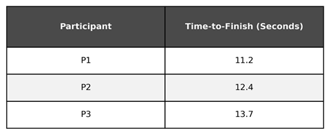 To give you an example, it’s more like we measure the time until each participant crosses the finish line, but we stop measuring at the 13 second mark. In this scenario, our table will look a little different: